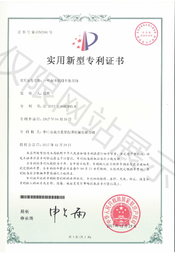 實用新型專利證書 -- 起重機(jī)用羊角吊鉤